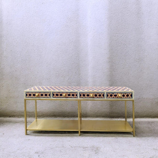 Original price SGD 798 - Original price SGD 798Original priceSGD 798SGD 798 - SGD 798Current price SGD 798A kaleidoscope of indigo‑blue and terracotta bone‑inlay tiles forms the tabletop’s geometric lattice, each piece hand‑set and framed by a slender a...